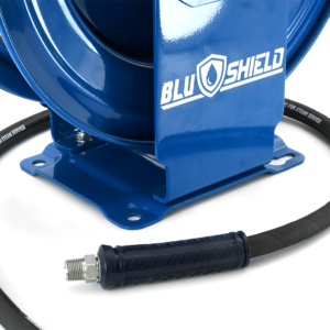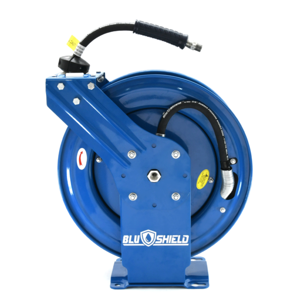 Blushield heavy duty pressure washer hose reel is constructed with powder coated 18 gauge heavy duty steel and have 12 pt. Ratchet Locking Mechanism. It comes with the lightest, strongest , most flexible & kevlar braided pressure washer hose. This combo is perfect for Automotive & DIY Industry. It is a great cost-effective alternative to motor driven reels.